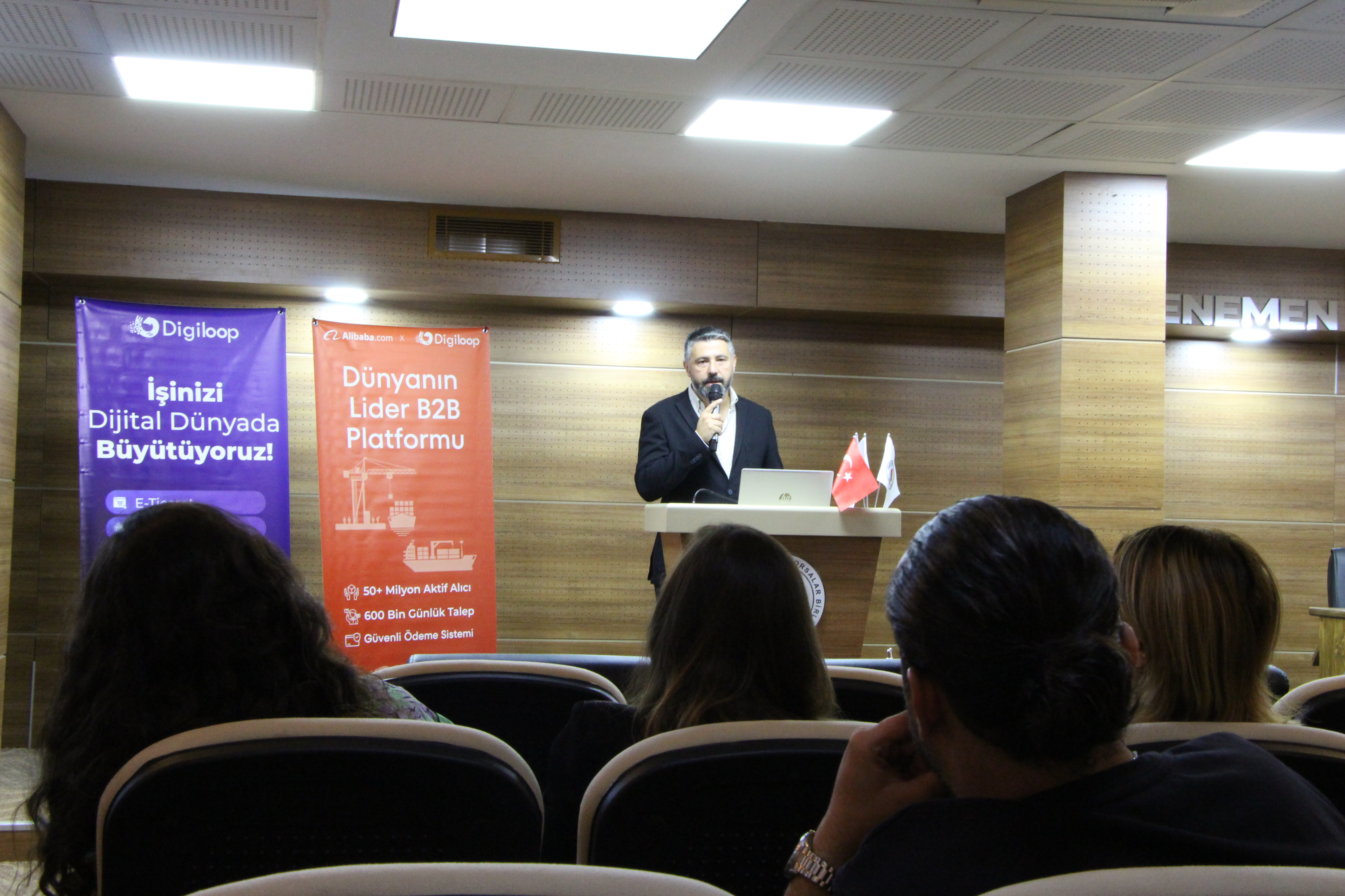 Odamız tarafından 23 Eylül 2025 tarihinde Mustafa Kemal Atatürk Konferans Salonu’nda düzenlenen “Yapay Zekâ ile E-Ticaret ve E-İhracat Zirvesi” kapsamında, Digiloop-Alibaba.com Kurumsal Satış Direktörü Sayın Hüdayi Torun ve İş Geliştirme ve Pazarlama Müdürü Sayın Kemal Özten, yapay zekâ teknolojilerinin dijital ticaret ve ihracat süreçlerine katkılarına ilişkin kapsamlı bir sunum gerçekleştirdi.